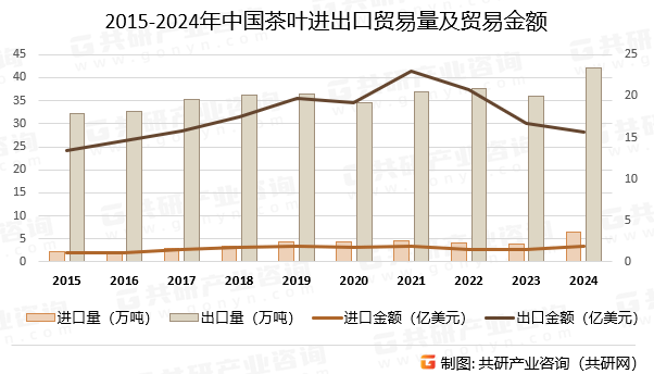 2024年,我国茶叶进口量增加至6。5万吨,年均复合增加率约为12。33%;茶叶出口量增加至42。02万吨,年均复合增加率约为3。01%;2024年,随净出口量的增加,我国茶叶进出口商业顺差增加至13。82亿美元,年均复合增加率约为6。51%;出口金额增加至15。68亿美元,年均复合增加率约为1。7%。