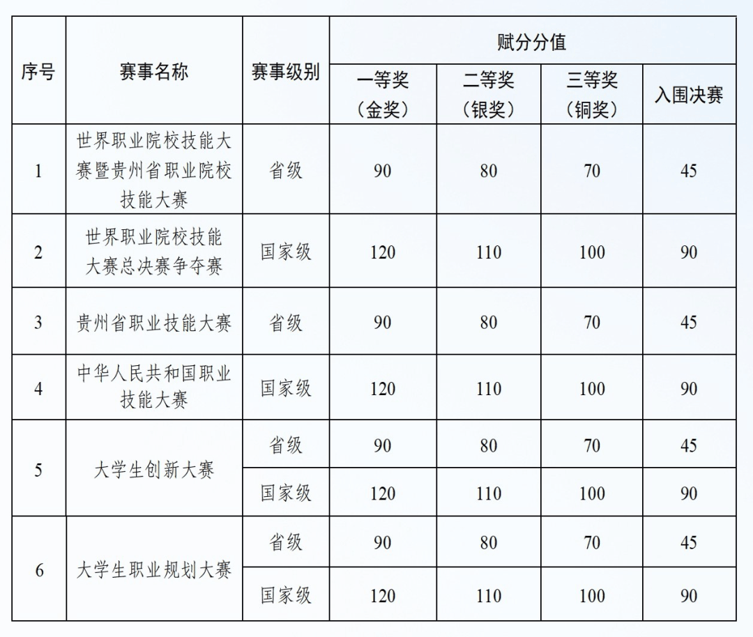 备注:1。加入大学生立异大赛,团队中排名前5名的赋划一级分值、排名6-10名的划一级分值减5分、排名11名及当前的划一级分值减10分;2。统一赛项,按获第一流别赋分,分值不累加;多个赛项获,只拔取赋分分值最高赛项赋分,分值不累加。